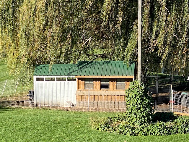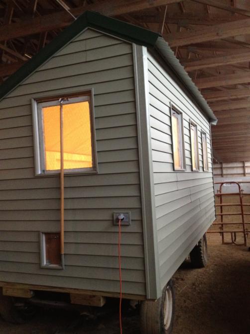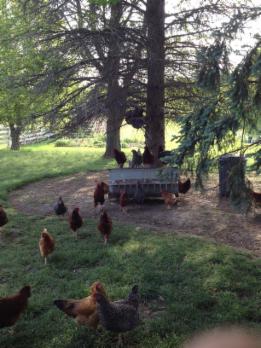 The SuperCoop - one of three coops we have. This one we constructed ourselves on an old hay wagon platform. The coop is 7x15, holds up to 70 chickens, and is insulated, paneled and has electricity.