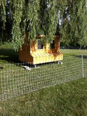 The Mini-Coop - our first coop which we purchased online, then insulated and paneled ourselves. It's a mobile 6x8 coop that houses up to 25 chickens. Shown here at pasture with the electric Poultry Net fencing that contains the yard. The coops are moved to fresh pasture every few weeks.