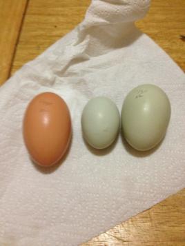 These two eggs were among several interesting eggs that were laid shortly after I moved the coop for the first time. Now the hens are used to being moved, so I don't see any difference in the eggs.
